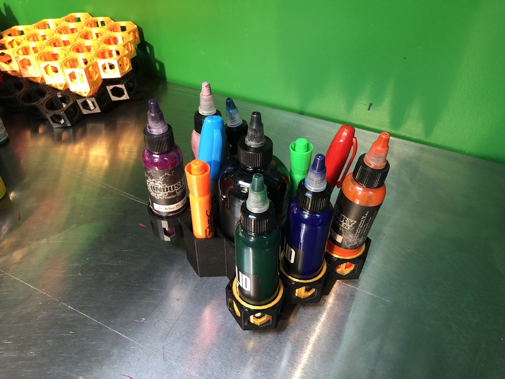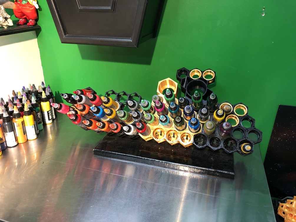 Organize your ink bottles with an over engineered system designed for 3d printing and test in tattoo shops.