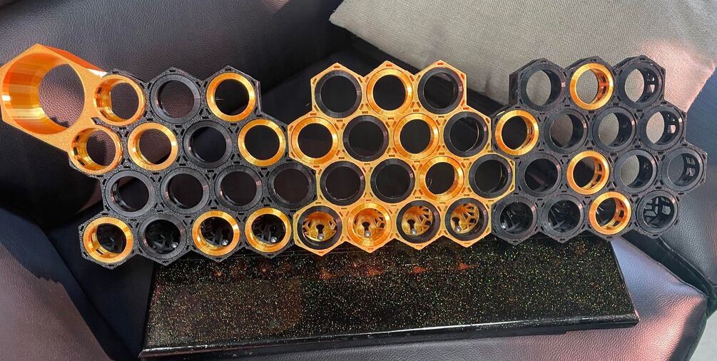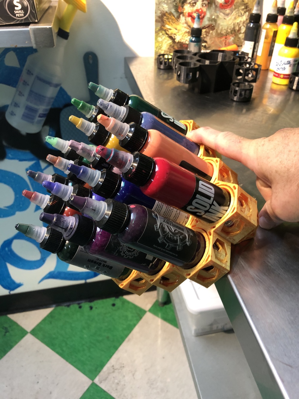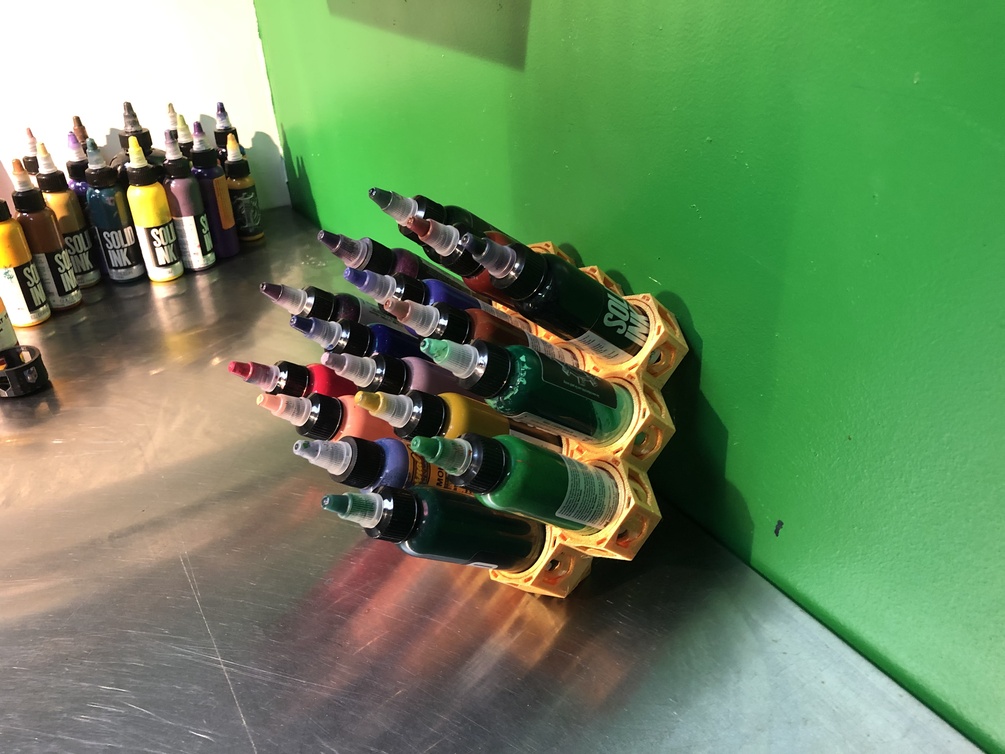 Organize your ink bottles with an over engineered system designed for 3d printing and test in tattoo shops.